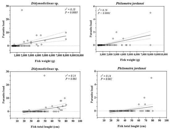 | Philometra jordanoi | r = 0.53, p < 0.0001 | r = 0.14, p = 0.001 |