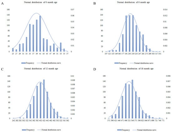Normal distribution of bovine body weight of the test population at different months of age. A shows the normal distribution of body weight at 0 months of age; B shows the normal distribution of body weight at 6 months of age; C shows the normal distribution of body weight at 12 months of age; D shows the normal distribution of body weight at 18 months of age. In the figure, the abscissa represents weight, the left ordinate represents frequency, and the right ordinate represents normal function values.