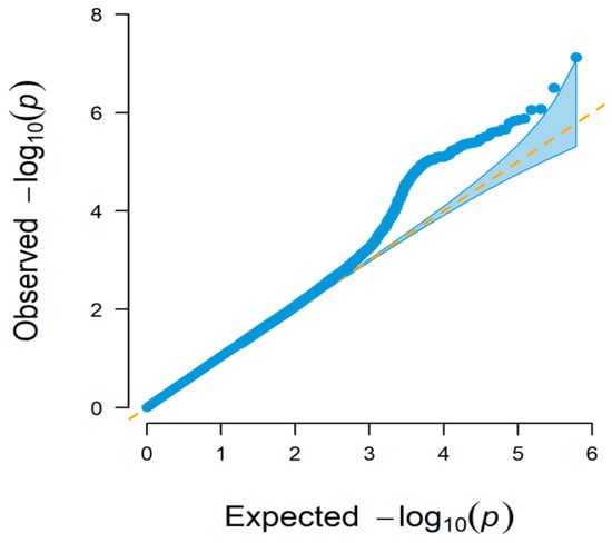 Quantile-quantile (Q-Q) plot of GWAS based on the random regression model. The x-axis and y-axis represent −log10 transformed expected p-values and observed p-values, respectively. The dots indicate −log10(p) of the SNPs and the diagonal line represents the expected values under the null hypothesis for no association.