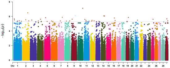 Manhattan plot of GWAS based on the random regression model. The horizontal axis shows the chromosomal position of the SNPs associated with body weight. The vertical axis indicates the absolute value of the −log10 (p) of individual SNPs.