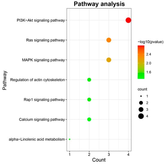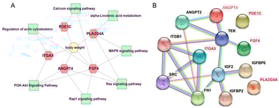 To further understand the function of candidate genes, GO and KEGG enrichment was performed using the R package “clusterProfiler” [29]. As shown in Figure 4, seven pathways were significantly enriched, of which five pathways were implicated in signal transduction, including PI3K-Akt signaling pathway (bta04151), Ras signaling pathway (bta04014), MAPK signaling pathway (bta04010), Rap1 signaling pathway (bta04015), and Calcium signaling pathway (bta04020); one pathway, regulation of actin cytoskeleton (bta04810), was involved in cell motility; one pathway was associated with lipid metabolism, namely alpha-Linolenic acid metabolism (bta00592). The information about these significant pathways is shown in Supplementary Table S3. No GO term was significantly enriched. Notably, FGF4, ANGPT4, ITGA5, and PLA2G4A involved in no less than two KEGG pathways deserved further attention and discussion. Additionally, based on animal QTLdb, the previous reports and gene function analysis, several candidate genes including TBC1D5, SHISA2, PDE1C, and COCX6 were also identified to affect the BW trait. The information of these candidate genes was listed in Table 2. Numerous candidate genes known to be related to BW in domestic animals were presented in Supplementary Table S4. PPI network shown in Figure 5 visualized the interaction between node proteins encoded by corresponding candidate genes.