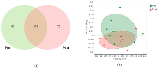 All of the samples with a coverage rate >99.9% and the α diversity indexes including Ace, Chao1, Shannon, and Simpson had no difference between the two groups (Table 3). The Venn diagram showed that 179 genera were shared between the two groups, and the pre- and post-weaning groups had 55 and 75 unique genera, respectively (Figure 1a). The principal coordinate analysis showed parts of the two groups separated from each other, with 25.77% and 20.31% of variations explained by the principal components PC1 and PC2, respectively. ANOSIM showed that the two groups had no statistical difference (R2 = 0.04, p = 0.21).