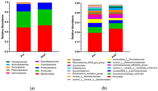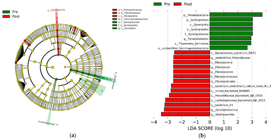 The linear discriminant analysis effect size (LEfSe) analysis of bacterial taxa within the two groups. (a) Cladogram shows significantly enriched bacterial taxa (from the phylum to genus level). (b) Histogram of the linear discriminant analysis (LDA) scores computed for differentially abundant rumen bacteria between the pre- and post-weaning groups. Significant differences are defined as p < 0.05 and an LDA of score >2.5. Pre: pre-weaning group; Post: post-weaning group.