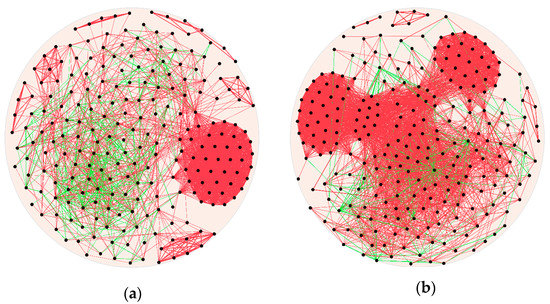 Bacteria community network analysis was used to explore the relationship between different genera. (a) Pre-weaning group. (b) Post-weaning group. The node represented the genus, which has a Spearman rank correlation coefficient of >0.6 or <−0.6. The thickness of the edges represents the correlation coefficient; the thicker the edge, the greater the correlation (all of the correlations were r > 0.6 or < −0.6, p < 0.05). The green line indicates a negative correlation, and the red line shows a positive correlation.