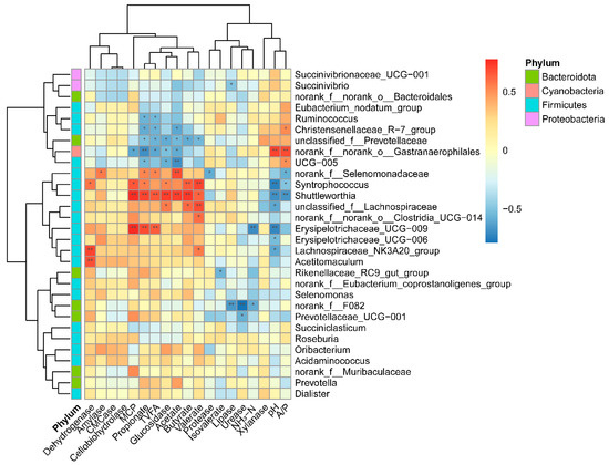 The correlation between bacteria (genus level) and enzymes, VFA, MCP, NH3-N, and pH. Cells are colored based on Spearman’s correlation coefficient: red represents a positive correlation, and blue represents a negative correlation. The darker the color, the stronger the correlation. “*” and “**” indicate false discovery rate (FDR)-adjusted p-values < 0.05, and <0.01, respectively. NH3-N: ammonium nitrogen; MCP: microbial crude protein; VFA: volatile fatty acid; TVFA: total volatile fatty acid; A/P: the ratio of acetate to propionate.