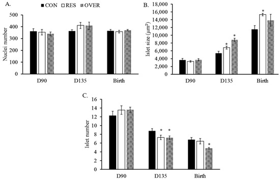 At d 135 of gestation, the islet size (Figure 1B) was 26 and 63% greater in the RES (6830 ± 388 μm2; p = 0.01) and the OVER (8836 ± 299 μm2: p < 0.01) offspring compared with CON (5404 ± 477 μm2). At d 135 of gestation, the islet number was reduced by 17% in RES (7.2 ± 0.52; p = 0.02) and OVER (7.2 ± 0.39; p = 0.04; Figure 1C) vs. CON (8.8 ± 0.53). At birth, the islet number was reduced in the OVER lambs (4.8 ± 0.17; p = 0.01) by 28% vs. CON (6.7 ± 0.50). Additionally, the islet size was 32% greater in RES at birth (p < 0.05; 15,326 ± 388 μm2) compared with CON (11,553 ± 952 μm2). No differences in the islet size or number were observed in the pancreas tissue of the day-90 fetuses (p ≥ 0.46).