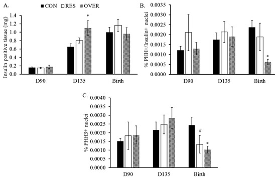 At birth, the β-cell proliferation was reduced by 73% in the OVER lambs (2.3 × 10−3 ± 3.0 × 10−4%) compared with the CON lambs (6.2 × 10−4 ± 1.4 × 10−4%; p = 0.01; Figure 2B) at birth. Likewise, there were 45 and 57% fewer total PHH3 positive cells in the RES (1.3 × 10−3 ± 5.0 × 10−4%; p = 0.07; Figure 2C) and OVER (1.0 × 10−3 ± 1.0 × 10−4%; p = 0.01) lambs, respectively, vs. the CON (2.4 × 10−3 ± 4.4 × 10−4%) lambs. Based on the reduction in cellular proliferation observed at birth, a TUNEL assay was performed to determine if there was an increased rate of apoptosis in the pancreas tissue. No difference in apoptosis was observed in the pancreas tissue of the offspring (1.51 ± 0.38%; 1.03 ± 0.41%; and 1.13 ± 0.44% for the CON, RES, and OVER fetuses, respectively; p = 0.67). No differences in the total cellular proliferation or proliferating β-cells were observed at d 90 or d 135 of gestation (Figure 2C; p ≥ 0.46).