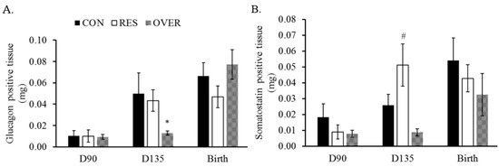 The somatostatin positive area was greater in RES (0.05 ± 0.01 μm2/g; p = 0.06) at d 135 of gestation compared with the CON (0.02 ± 0.006 μm2/g) and OVER fetuses (0.008 ± 0.002 μm2/g; p < 0.01; Figure 3B). No differences in the glucagon or somatostatin positive tissue were observed at d 90 of gestation or at the birth time point (p ≥ 0.40; Figure 3A,B).