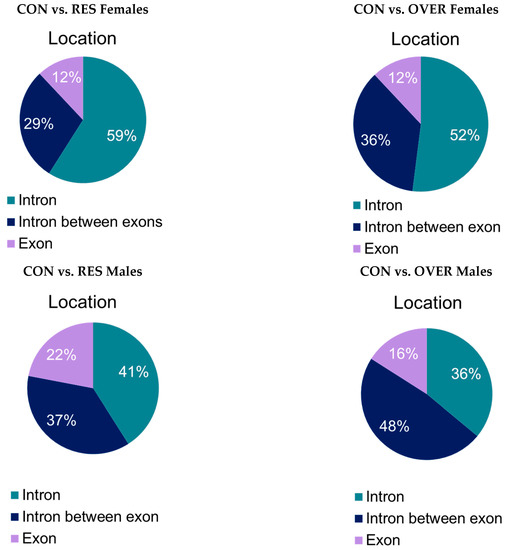 A comparison of the CON females with the RES females identified 2416 DML and 34 DMRs (Table 2). A lesser amount of DML (1874) and DMRs (48) were identified when comparing the CON females with the OVER females (Table 2). For the comparison of the CON vs. the RES males, 1514 DML and 64 DMRs were identified. A total of 608 DML and 25 DMRs were identified when comparing the CON males with the OVER males (Table 2). The majority of the DMRs identified were located in introns (Figure 4), with these results being similar within the respective sexes.