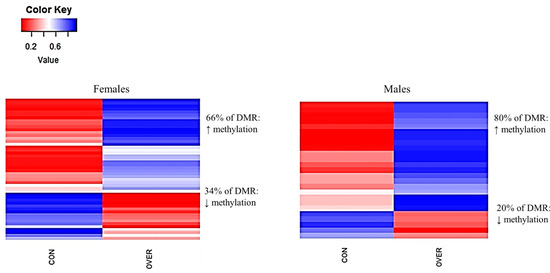 In comparing the DMRs of the RES male offspring with the CON males, 93% were hypermethylated and 7% were hypomethylated (p = 0.001; Figure 5). In the OVER females, 66% of the DMRs were hypermethylated, while 34% of DMRs were hypomethylated compared with CON (p = 0.001; Figure 6).