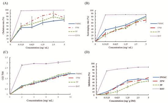 Both phenols and flavonoids were found to have high antioxidant capacities. The antioxidant capacities are shown in Figure 1, including the ferrous ion chelation rate (Figure 1A), Di (phenyl)-(2,4,6-trinitrophenyl) iminoazanium (DPPH) scavenging capacities (Figure 1B), total reducing capacities under 700 nm absorbance (Figure 1C), and malondialdehyde production inhibition rate (Figure 1D). Among them, PWMC, FPW, and PP had similar and high antioxidant capacities in all experiments.