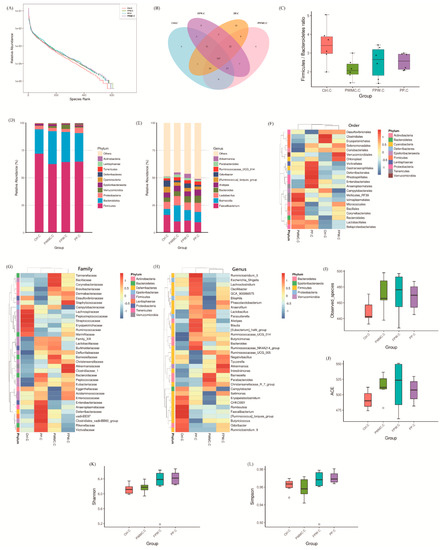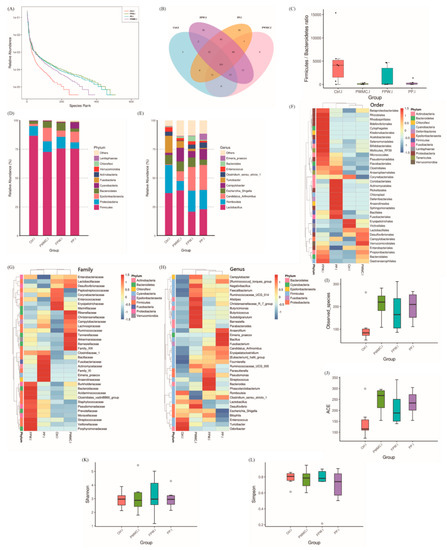 The 35–day–old broilers’ cecum microbiota influenced by a corn–soybean basal diet (Ctrl), Pennisetum pur–pureum Schum No. 2 waste mushroom compost (PWMC), Saccharomyces cerevisiae fermented PWMC (FPW), and Pennise–tum purpureum Schum No. 2 (PP). (A) Microbe relative abundance; (B) Microbe Venn diagram; (C) Firmicutes to Bacteroide–tes ratio; (D,E) Relative abundance of each microbe in the broilers’ cecum at the phylum (D) or genus (E) level; (F–H) Taxa heatmap of cecum microbes according to order (F), family (G) and genus (H). (I–L) Alpha diversity of 35–day–old broilers’ ileum microbes in each treatment; (I) Observed species, (J) Abundance-based coverage estimator (ACE), (K) Shannon index, and (L) Simpson index. Results are means of six samples obtained from the individual birds from the control and experimental groups (p < 0.05).