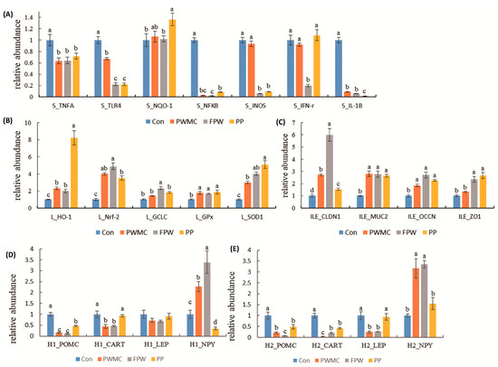 Relative abundance of mRNA expression in 35–day–old broilers given a corn–soybean basal diet (Con), Pen–nisetum purpureum Schum No. 2 waste mushroom compost (PWMC), Saccharomyces cerevisiae fermented PWMC (FPW), and Pennisetum purpureum Schum No. 2 (PP). (A) Inflammatory-related mRNA expression in broilers’ spleen; (B) Antiox–idant-related mRNA expression in broilers’ livers; (C) Gut barrier-related mRNA expression in broilers’ ileum; (D,E) Ap–petite-related mRNA expression in broilers’ hypothalamus before (H1, D) and after fasting (H2, E). Results are means of six samples obtained from the individual birds from the control and experimental groups. a–c Means within the same rows with distinct superscript letters are significantly different (p < 0.05).