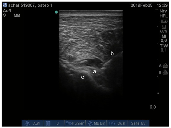 Ultrasonographic image of the right sciatic nerve (a), needle (b), ilium (c).
