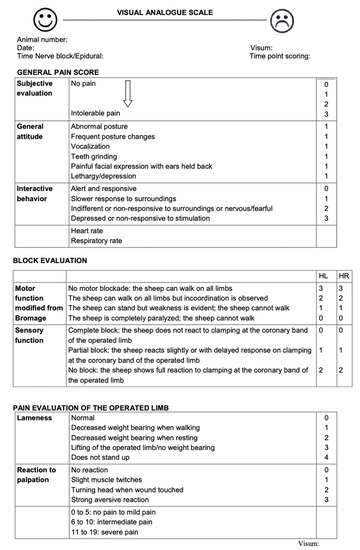 Prior to surgery a sheep grimace scale and a multidimensional pain score were applied to all animals once daily for 6 days to allow proof of health of the animals as well as to promote acclimatization to the scoring procedure (Figure 3 and Figure 4) [38]. The multidimensional pain score consisted of the following individual surveys: VAS (Visual Analog Scale, 10 cm horizontal line), general pain score, block evaluation score and pain evaluation score of the operated limb (Figure 4).