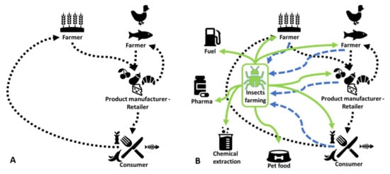 Enhancing of Circular Economy via insects farming. (A) and (B) represents the strengthening of the circular economy via edible insect farming.