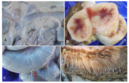 Findings observed after post-mortem examination of the calves. (A) Moderately enlarged mesenteric lymph nodes. Calf #050917, group A; (B) mesenteric lymph node with marked proliferation of cortical lymphoid tissue. Calf #300917, group A; (C) dilatation and signs of lymphangitis on the serosa of the ileum. Calf #300917, group A; and (D) folding of the ileal mucosa. Calf #011017, group A.