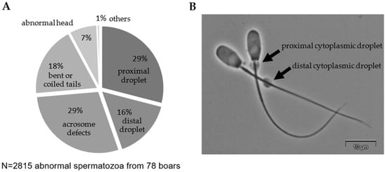 Figure 2. Morphological defects in short-term stored semen samples. (A) Distribution of sperm defects in the samples analyzed after 24 h storage at 17 °C. In case of multiple abnormalities per spermatozoon, only one defect was assigned to the cells. The hierarchy for scoring sperm defects was: (1) multiple sperm parts (e.g., two tails), (2) loose heads, (3) acrosome defects (e.g., detached acrosome), (4) head abnormalities (e.g., tapered head), (5) abnormalities in the neck, mid-piece, principal, and end piece (e.g., bent tails), and (6) cytoplasmic droplets. (B) Exemplary phase-contrast image of boar spermatozoa with either a proximal or a distal cytoplasmic droplet.
