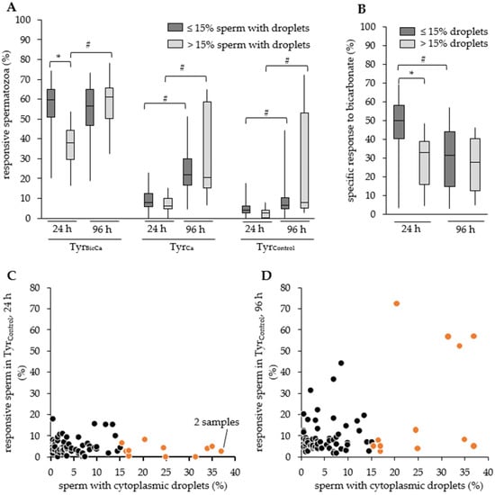 Figure 3. Storage effect on sperm responsiveness to capacitation stimuli in relation to the presence of sperm with cytoplasmic droplets. (A) Responsive spermatozoa in different media after 24 h or 96 h semen storage for samples with ≤15% of spermatozoa with cytoplasmic droplets (n = 66 boars) or >15% of spermatozoa with cytoplasmic droplets (n = 12 boars). Responsiveness was calculated based on the propidium iodide- and Fluo-3-low sperm population as the difference (Δ) between the values at the beginning (3 min) and after 60 min incubation (Δ3–60 min = 3 min–60 min) in a capacitating medium with 15 mM bicarbonate and 2 mM calcium (TyrBicCa) or in non-capacitating variants with either 2 mM calcium (TyrCa) or 1 mM EGTA (TyrControl). * indicates significant differences between the sample groups (p < 0.05). # indicates significant difference for a given group between storage times (p < 0.05). (B) The specific response to bicarbonate was calculated as the difference (Δ) in response to a full capacitating medium (TyrBicCa) within 60 min minus the response to a calcium-containing control medium (TyrCa) within 60 min. An asterisk indicates significant differences between the sample groups (p < 0.05). A hash indicates significant differences for a given group between storage times (p < 0.05). (C,D) Dot plot of the responsive sperm population after 24 h storage (B) or 96 h storage (C) in relation to the percentage of sperm with cytoplasmic droplets (proximal and distal) within a sample. Orange dots are samples with >15% of spermatozoa with cytoplasmic droplets (n = 12 boars).