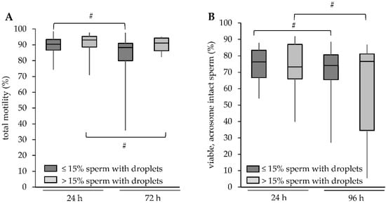 Figure 4. Storage effect on motility and viability in relation to the presence of sperm with cytoplasmic droplets. Change in (A) motility and (B) viable, acrosome-intact spermatozoa with increasing storage time at 17 °C. A hash (#) indicates significant differences (p < 0.05) between the two storage times for samples with ≤15% of spermatozoa with cytoplasmic droplets (CD; n = 66 boars) or samples with >15% of spermatozoa with cytoplasmic droplets (n = 12 boars). A hash indicates significant differences between storage times (p < 0.05).