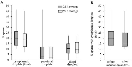 In addition, 11 extended semen samples (n = 11) with an elevated number of spermatozoa with cytoplasmic droplets were assessed for changes in the percentage of sperm with proximal or distal cytoplasmic droplets after 24 h and 96 h of storage at 17 °C. In addition, cells were also evaluated prior to and after a 120 min incubation period at 38 °C after 24 h and 96 h storage, respectively.