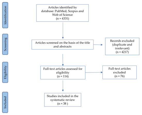 The search query identified 114 articles (69 in PubMed, 32 in Scopus, and 13 on the Web of Science). After evaluating the titles and abstracts of all articles, we selected the papers; after removing irrelevant and duplicate papers, only papers published in journals indexed on the Pubmed [35], Scopus [36], and Web of Science [37] were included. Ultimately, a total of 38 papers met the inclusion criteria. Figure 1 illustrates the PRISMA (Preferred Reporting Items for Systematic Reviews and Meta-Analyses) flow-chart process [34] for study selection.