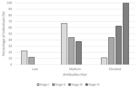 Relationship between clinical stage (stage I: mild disease, stage II: moderate disease, stage III: severe disease, and stage IV: very severe disease) and the presence of antibodies (low: <1:100; medium: between 1:100 and 1:400, and elevated: >1:400).