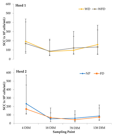 - Schwarz, D.; Diesterbeck, U.S.; Failing, K.; König, S.; Brügemann, K.; Zschöck, M.; Wolter, W.; Czerny, C.P. Somatic cell counts and bacteriological status in quarter foremilk samples of cows in Hesse, Germany—A longitudinal study. J. Dairy Sci. 2010, 93, 5716–5728. [Google Scholar] [CrossRef]