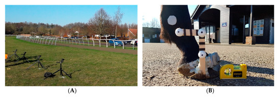 This study required a visual cue from which to track hoof motion in the sagittal plane. Custom-made hoof marker wands were therefore created, similar to previous studies, e.g., [26,27], with a design that ensured they projected above the ground level even on soft surfaces. They consisted of two wooden sticks glued together at 90 degrees, supporting white polystyrene balls that could be easily detected when filming at a distance of approximately 8.5 m away from the horse and jockey. The hoof wands were secured to the lateral aspect of the right fore and right hind hooves of each horse using Superfast hoof adhesive (Figure 1B).
