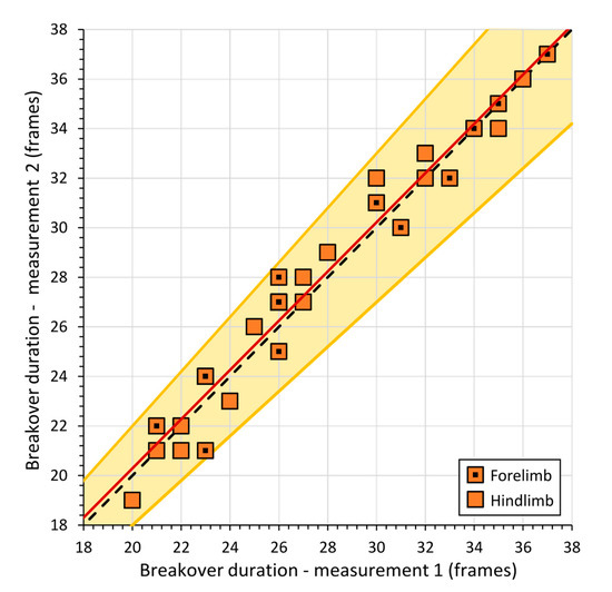 Reproducibility of breakover duration data quantified using Tracker software. Dashed line is a 1:1 line and the shaded band indicates ±10% deviations from this line. The solid red line shows the linear best fit to the combined forelimb and hindlimb data (y = 98 x + 0.70, r2 = 0.96, n = 30). The mean deviation of the data was ±3%, ±2 S.D. = ±0.05%, which is equivalent to a mean difference in breakover duration of 0.8 ± 1.2 frames (mean ± 2 S.D.).