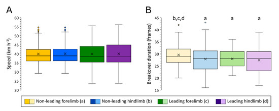 Boxplots illustrating distribution in speed (A) and breakover duration (B) data across individual limbs. Significant differences (p < 0.05) in means (marked ×) between the non-leading forelimb (yellow, ‘a’), the non-leading hindlimb (blue, ‘b’), the leading forelimb (green, ‘c’) and the leading hindlimb (purple, ‘d’) are indicated.