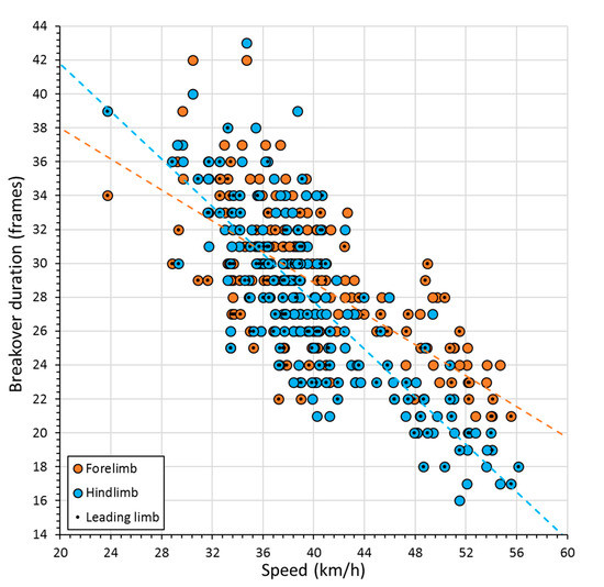 Negative relationship between breakover duration and gallop speed. Data are presented for leading (black dots) and non-leading (open circles) forelimbs (orange) and hindlimbs (blue). The forelimb data fit to a regression line, where y = −0.46 x + 47.12 (r = 0.7). The hindlimb data fit to a regression line, where y = −0.70 x + 55.79 (r = 0.8).