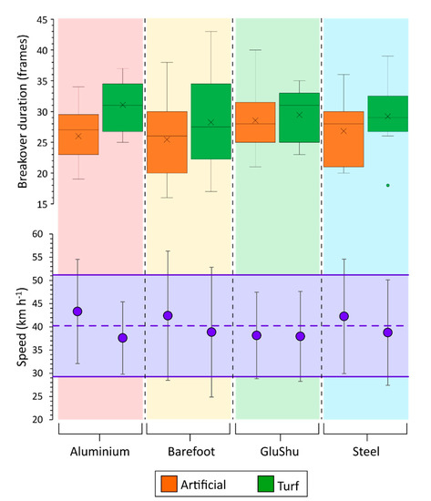 Boxplots illustrating the influence of shoeing condition and surface on breakover duration in the non-leading hindlimb. Data are clustered by shoe type for artificial (orange) and turf (green) data. The mean speed across the data set is illustrated by the dashed purple line, with ±2 S.D. falling within the shaded purple area and bounded by the solid purple lines. The mean speed ±2 S.D. for each shoe–surface category is marked by the purple circles.