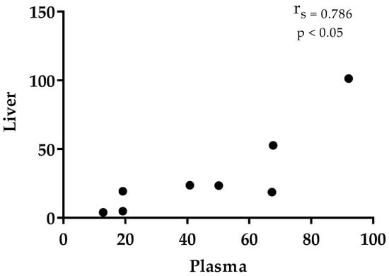 Figure 2. Correlation between liver (ng/g DM) and plasma (ng/mL).