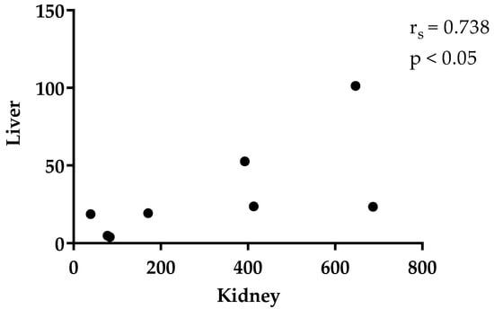 Figure 3. Correlation between liver and kidney (ng/g DM).