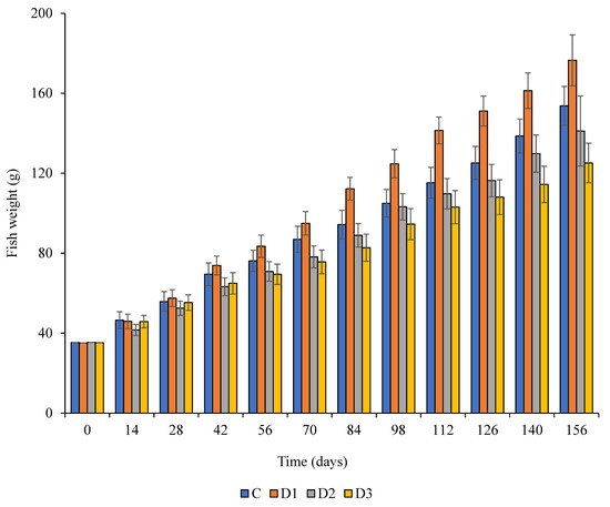 Average weight gain of fish under the four different dietary treatments over a period of 156 days; Control (C)—(100% FM; 0% BM); BM33 (D1)—(67% FM; 33% BM); BM67 (D2)—(33% FM; 67% BM) and BM100 (D3)—(0% FM; 100% BM).