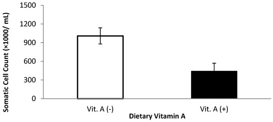 Similar results have also been observed using the rat model. S. aureus is the most common bacterium that causes mastitis [33], and Wiedermann et al. [34] observed that vitamin A deficiency predisposes rats to S. aureus infection. Wiedermann et al. [34] also indicated decreased phagocytic activity and bacterial killing of peritoneal macrophage for S. aureus. One of the main reasons neutrophil function might be diminished during vitamin A deficiency is that neutrophils and other granulocytes, developed from myeloid stem cells in the bone marrow, are mediated by retinoic-acid-binding to retinoic acid receptors to stimulate gene expression [35]. In general, SCC and SC linear score declined over the 21 d postpartum (data not shown), possibly related to the higher SCC at the beginning for the lactation.