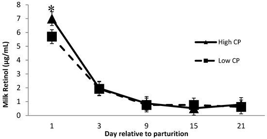 Milk retinol was affected by dietary crude protein over time (Figure 2), where cows receiving high crude protein had greater (p = 0.04) milk retinol than cows receiving low crude protein 1 day after calving. Minimal research has been performed investigating the relationship between milk retinol and prepartum dietary crude protein. Lindberg et al. [16] reported a significant difference in serum RBP concentration between cows receiving low and high crude protein diets during the prepartum period and speculated that the effect of dietary protein levels on RBP might be related to the amino acid availability to synthesize RBP. This might explain the greater milk retinol concentration at day 1 postpartum from cows receiving high CP diets. Although, more investigations are required to better understand the potential effect of protein × monensin interaction on the milk retinol concentration.