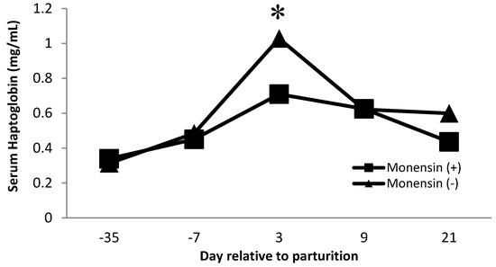 Serum haptoglobin is an acute-phase protein that has been used as an inflammatory marker in dairy cows [38,39,40]. Haptoglobin acts by sequestering iron found in hemoglobin and avoiding the utilization of iron by bacteria. Furthermore, free hemoglobin promotes oxidation, so haptoglobin is also affected indirectly as an antioxidant [41]. Our observations follow similar observations in serum haptoglobin during the transition period, where serum haptoglobin concentrations increase near the time of parturition [40,42]. There was a monensin × time interaction (p = 0.01, Figure 3) on serum haptoglobin concentration. Cows that did not receive monensin had greater haptoglobin concentrations on day 3 postpartum than cows receiving monensin. The decrease in serum haptoglobin concentration for cattle receiving monensin may be partly related to the effect of monensin on changing rumen microflora. Monensin is known to increase the microbial population that produces propionate, improving energy metabolism [43,44]. The increase in glucose production may lead to fewer subclinical metabolic disorders such as hyperketonemia and fatty liver syndrome by decreasing negative energy balance during the transition period [44].