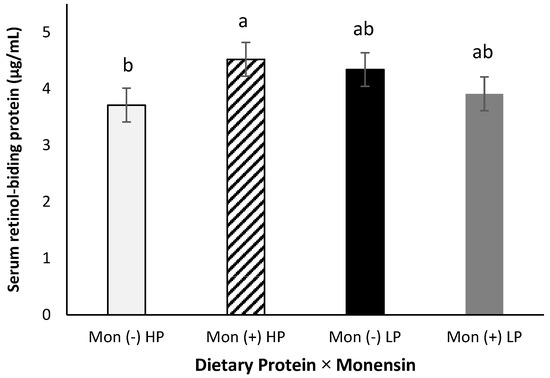 Serum retinol-binding protein showed a protein × monensin interaction (p = 0.04, Figure 4), where cows fed with the combination of high CP and monensin showed a greater RBP concentration than cows fed with high CP and no monensin (4.52 vs. 3.71 µg/mL). This interaction might be related to combining a better amino acid availability (from the high CP) and energy metabolism (from monensin inclusion). Lindberg et al. [16] showed that a greater dietary protein increased hepatic transport proteins, such as RBP, indicating a positive impact on the synthesis and release. In the current study, serum RBP concentration was not significantly affected by dietary crude protein alone (p > 0.98). This difference between the results observed in the present study and the Lindberg et al. study might be attributed to the higher crude protein concentration in prepartum diets used by Lindberg et al. We [48] also did not observe a difference in serum RBP of rats fed different levels of dietary crude proteins supplemented with or without vitamin A.