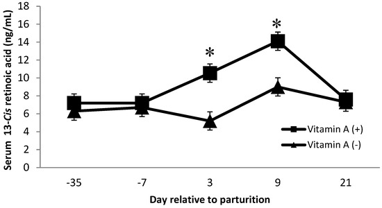 Dietary factors contributed to changes in serum concentrations of 13-cis and all-trans retinoic acid. There was a vitamin A × protein interaction on 13-cis retinoic acid (p = 0.02), where cows receiving vitamin A and low crude protein showed a greater concentration. Furthermore, on day 3 and day 9 postpartum, cows receiving vitamin A supplementation had greater (p < 0.01) concentrations of 13-cis retinoic acid than cows that did not receive a vitamin A supplement (Figure 5). Van Merris et al. [14] demonstrated that nulliparous cows with experimentally induced Eschericia coli mastitis had significantly reduced serum concentrations of 13-cis retinoic acid. Therefore, we speculate that the increase in 13-cis retinoic acid at day 3 and day 9 for cows supplemented with vitamin A may have been related to the decrease in SCC for cows supplemented with vitamin A. However, further investigations are needed to better understand the interaction of dietary protein and vitamin A on 13-cis retinoic acid. In addition, diets did not alter serum 13-cis or all-trans retinoic acid concentrations over time (p = 0.30 and 0.80, respectively, data not shown).