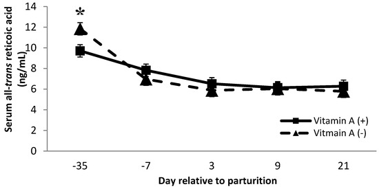 Similar to serum retinol concentration, no significant treatment effect was detected over time for either α-tocopherol or β-carotene (p = 0.96 and 0.98, respectively; data not shown). As reported by previous studies [17,50,52], both serum α-tocopherol and β-carotene decreased around the time close to the parturition and recovered postpartum. The dramatic decrease in serum vitamin concentration occurs likely because of the large requirements needed for colostrogenesis. This occurs via diet supplies, and stored lipid-soluble vitamins, such as vitamin A, are shunted toward the mammary gland [49].