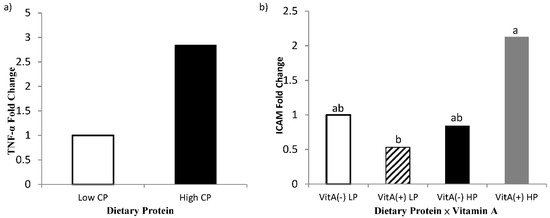 Fold change of PBMC gene expression of tumor necrosis factor-α (TNF-α; Panel a) and intercellular adhesion molecule-1 (ICAM; Panel b) for multiparous Holstein dairy cows (n = 80, total) that were fed diets with crude protein levels (10.3%, n = 40 vs. 12.2% dry matter basis, n = 40), and within each crude protein group fed monensin (400 mg/day per head or none) and vitamin A (110 IU/kg body weight or none) during prepartum period (from day −35 to the day of calving). All cows received a common lactation ration postpartum. Dietary crude protein effect and dietary protein × vitamin A interaction (p = 0.04, 0.05, respectively).