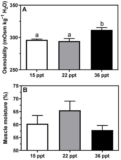 Changes in (A) plasma osmolality and (B) muscle water content in S. dumerili individuals acclimated to different environmental salinities (15, 22, and 36 psu). Data are presented as mean ±SEM (n = 10–11). Different superscript letters indicate significant differences among salinities (p < 0.05, one-way ANOVA followed by Tukey´s post hoc test).