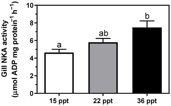 Gill NKA activity in S. dumerili individuals acclimated to different environmental salinities (15, 22, and 36 psu). Data are presented as mean ± SEM (n = 11–12). Different superscript letters indicate significant differences among salinities (p < 0.05, one-way ANOVA followed by Tukey´s post hoc test).