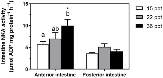 Intestine NKA activity in the anterior and posterior intestine in S. dumerili individuals acclimated to different environmental salinities (15, 22, and 36 psu). Data are presented as mean ±SEM (n = 7–12). Different superscript letters indicate significant differences among salinities in a given intestinal region. Asterisks (*) indicate significant differences between intestinal regions within a given salinity (p < 0.05, two-way ANOVA followed by Tukey´s post hoc test).