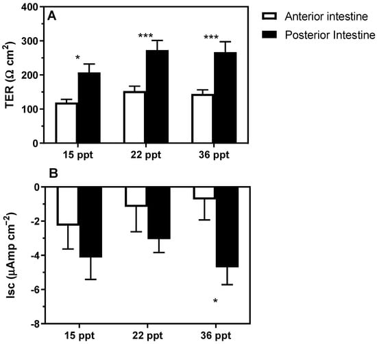 (A) Transepithelial electrical resistance (TER, Ω cm2) and (B) short-circuit current (Isc, μA cm−2) in the anterior and posterior intestine in S. dumerili individuals acclimated to different environmental salinities (15, 22, and 36 psu). Data are presented as mean ± SEM (n = 8). Post hoc significance levels are indicated by asterisks (*) used to indicate significant differences between intestinal regions within a given salinity (* p < 0.05, *** p < 0.001; two-way ANOVA followed by Bonferroni´s post hoc test).