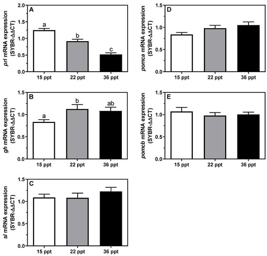 Changes in mRNA expression levels (relative to actb and eef1a) of adeno-hypophyseal (A) prl, (B) gh, (C) sl, (D) pomca, and (E) pomcb in S. dumerili individuals acclimated to different environmental salinities (15, 22, and 36 psu). Data are presented as mean ± SEM (n = 9–12). Different superscript letters indicate significant differences among salinities (p < 0.05, one-way ANOVA followed by Tukey´s post hoc test).