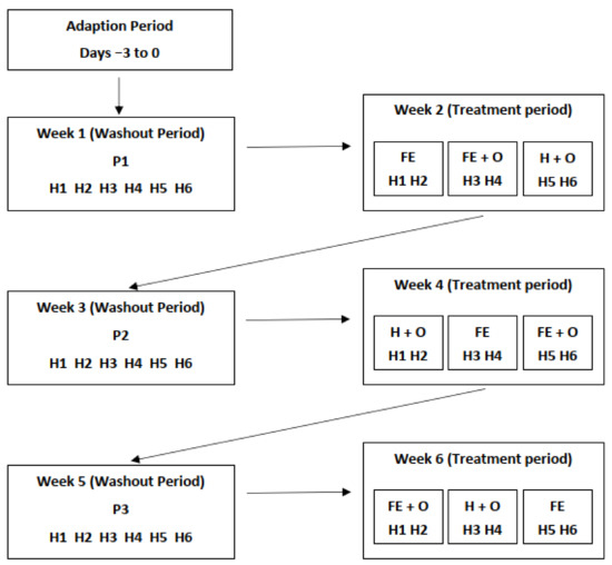 Illustration of the experimental design for the six-week study period. H1–H6 represents the 6 horses used; P1, P2 and P3 (cut pasture fed in stables during weeks 1, 3 and 5, respectively); FE—chopped ensiled Lucerne and Timothy; FE + O—chopped ensiled Lucerne and Timothy fed with whole oats; and H + O—hay fed with whole oats.