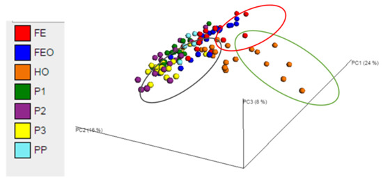 There were no significant differences in the alpha and beta diversity between samples from time points T120, T144 and T168 (ie. faecal samples collected on days 5, 6 and 7, respectively) at the genus level (ANOSIM, p = 0.754; Table S3). However, there were significant effects of diet on the beta diversity of the bacterial genera in the faeces (ANOSIM, p = 0.001). Principal coordinate analysis at genus level showed clustering of samples by diet, with ~48% of the variation explained on three principal coordinate axes (Figure 2). The UPGMA dendrograms showed that the faecal bacterial community of horses when fed Diet H + O clustered separately to the Diets P1, P2, P3, FE and FE + O (Figure S2). The diets containing ensiled chopped forage (FE and FE + O) appeared as one cluster on the PCoA plots (Figure 2). While the diets containing cut pasture were another cluster, Diet P1 (restricted cut pasture) appeared to cluster separately from Diets P2 and P3 (ad libitum cut pasture). Although there was some overlap, Diet P1 and Diet PP clustered more closely and were positioned between the Diets P2, P3 and Diets FE, FE + O on the PCoA plots and UPGMA dendrograms (Figure 2 and Figure S2).